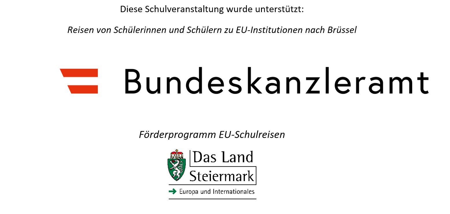 Diese Schulveranstaltung wird im Rahmen von Reisen von Schülerinnen und Schülern zu EU-Institutionen nach Brüssel vom Bundeskanzleramt sowie vom Land Steiermark im Rahmen des Förderprogramms EU-Schulreisen gefördert.