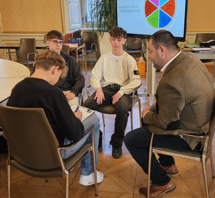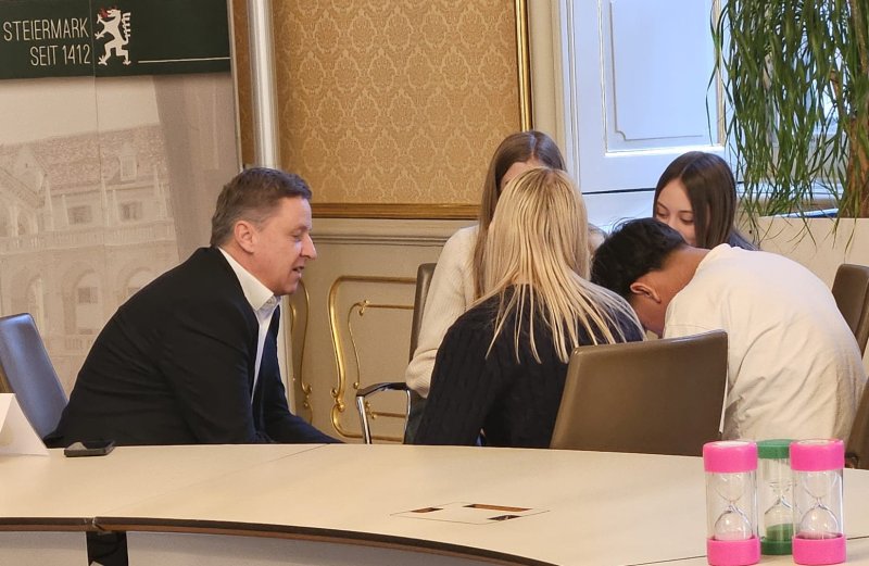 Am Vormittag besuchten die Schülerinnen und Schüler die Politikwerkstatt im Landhaus Steiermark. Dort erhielten sie einen anschaulichen Einblick in die Arbeit des Landtages und traten in direkten Austausch mit im Landtag tätigen Politikerinnen und Politikern. In Kleingruppen bereiteten die Schülerinnen und Schüler im Vorfeld Fragen vor, die sie anschließend den jeweils zugeteilten Politikerinnen und Politikern stellten, wodurch sie aktuelle politische Themen diskutieren und unterschiedliche Standpunkte unmittelbar kennenlernen konnten. Dies förderte nicht nur das politische Interesse, sondern auch das Verständnis für demokratische Entscheidungsprozesse.