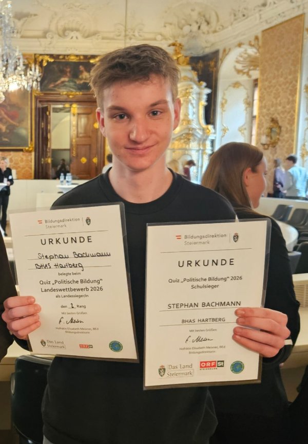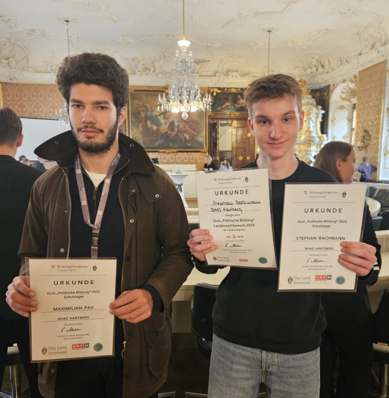 Am 26. März 2026 wurde in Graz einmal mehr deutlich, wie lebendig und praxisnah Politische Bildung an der BHAK und BHAS Hartberg vermittelt wird. Beim Landeswettbewerb „Schüler/innenquiz Politische Bildung 2026“ stellten zwei Schüler der BHAK/BHAS Hartberg ihr Wissen eindrucksvoll unter Beweis.